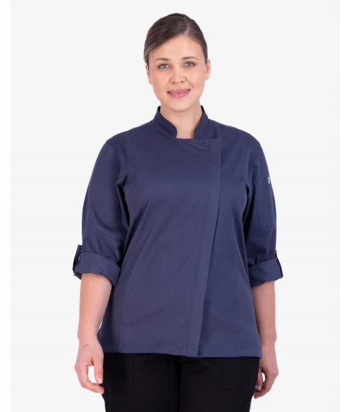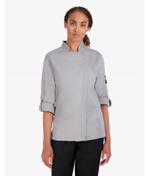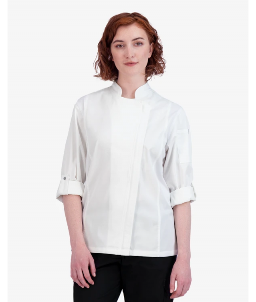 Featuring a modern design in comfortable stretch cotton with performance details, the Women's Nova Long Sleeve combines fashion and function in a contemporary executive chef coat.